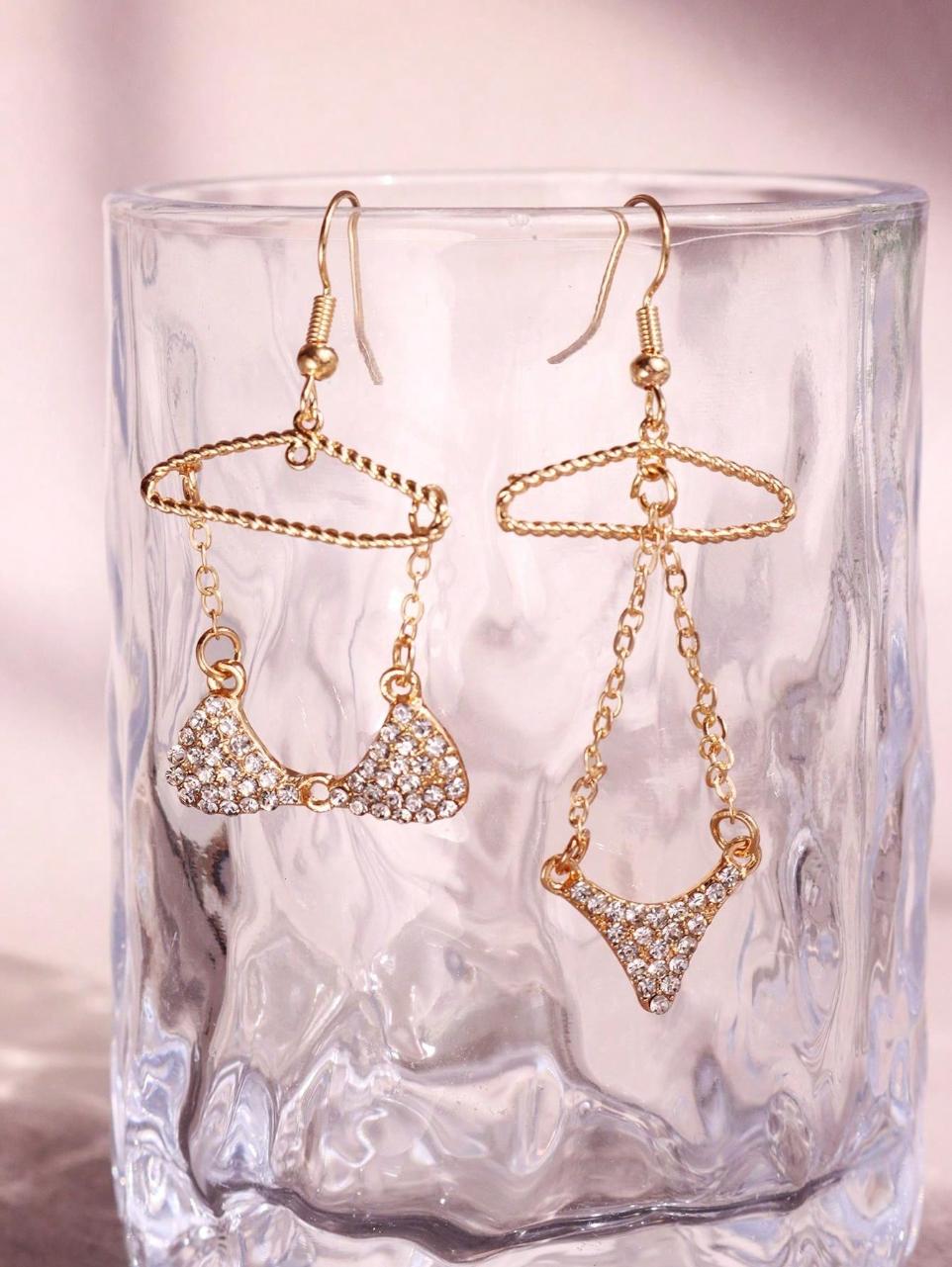 Diseños exclusivos y coquetos que capturan la sensualidad de la lencería en miniaturas bañadas en dorado: un arete con forma de *panties* y su par con un *brasier* delicado, adornados con destellos de piedras brillantes.